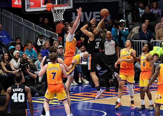 本场比赛中,马刺的替补侧翼大将凯尔登-约翰逊(Keldon Johnson)的表现算得上是令人大跌眼镜。约翰逊全场出场15分54秒,投篮5中1,三分线外3中0,罚球4中4,得到了6分2篮板1助攻1抢断的数据,正负值为-3。约翰逊在攻防两端的表现都是不太突出的,他在进攻端并没有将自己的得分能力展现出来,他在三分线外的手感更是很不理想,他也没有什么其他方面的表现,他在进攻端可以说是完全被对手限制了,完全没有发挥出自己的特点。约翰逊在防守端的表现也是不太理想的,也是很难起到作用的。总体来看,约翰逊在本场比赛中的表现完全达不到大家的预期,这也在一定程度上导致了球队的这场失利。