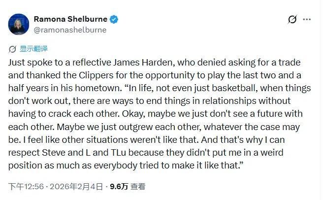 当然,交易达成后,关于“哈登这次到底是不是主动提出交易申请”成了一个争议话题,ESPN资深记者罗蒙娜·谢尔本(Romona Shelburne)在社交媒体上发表了一段哈登的表述,称哈登表示并没有主动向快船提出“交易申请”,“我不愿成为阻碍快船未来发展的绊脚石,希望他们能真正获得重建机会并积累选秀资本。而在克利夫兰,我看到了东部争冠的契机,尽管我渴望留在洛杉矶再战,毕竟从未夺冠过,但作为篮球运动员,我认为这里(克利夫兰)更有机会。”